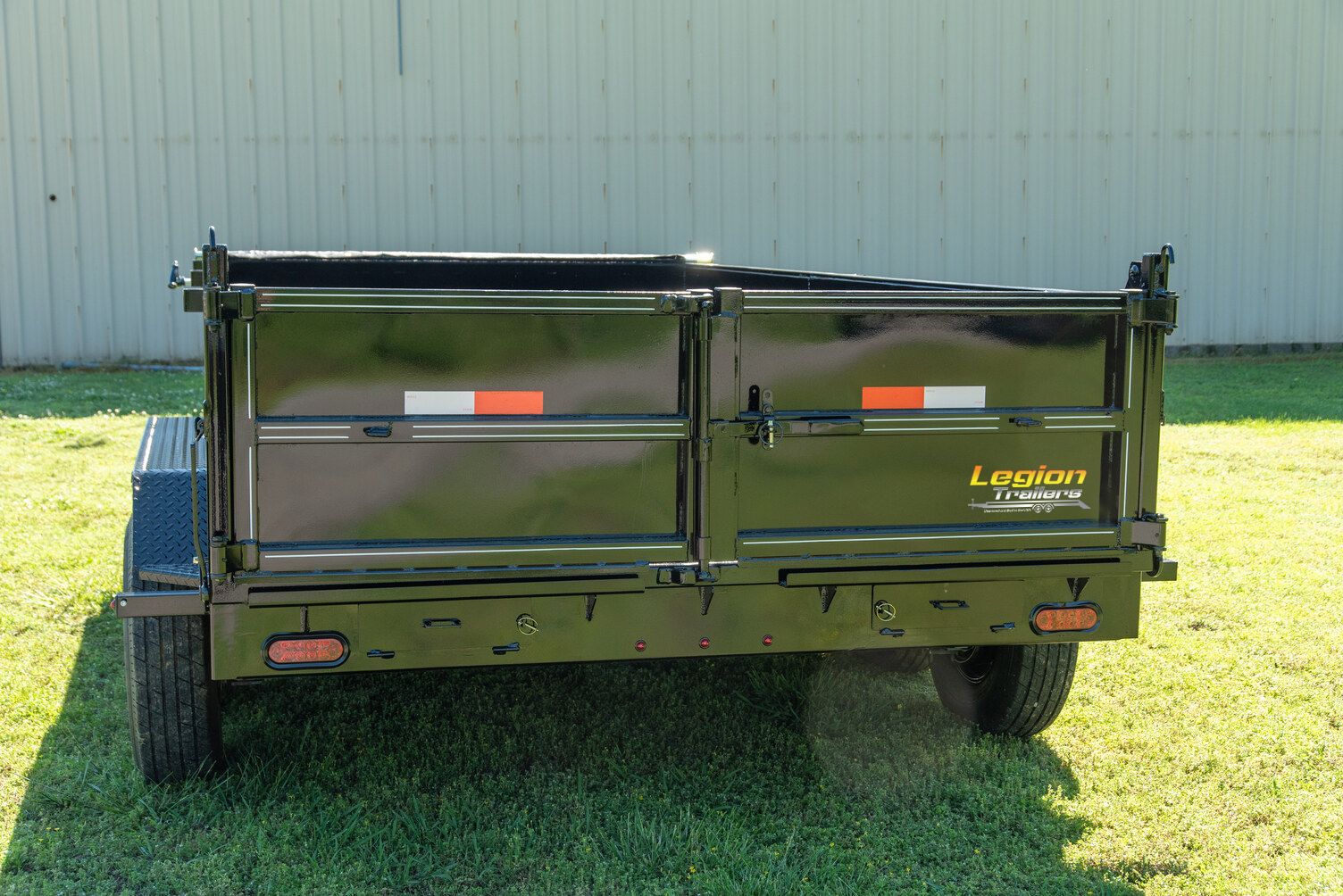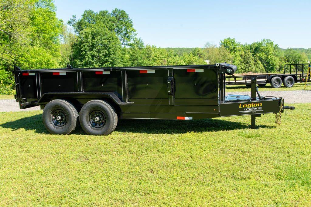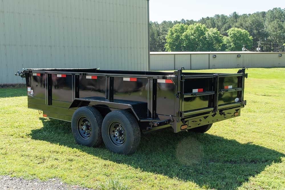 Dump Trailers come standard with: Side marker lights, 2ft sides w/ 12ga sidewalls, 10ga floors, 3-way rear door and a tarp.